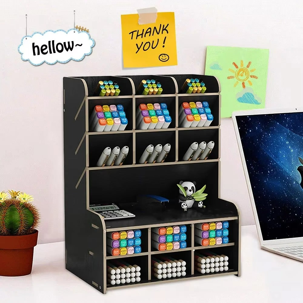Featuring 9 tilted compartments and 9 flat-bottom slots, this pen organizer offers plenty of space for pens, markers, rulers, scissors, paper clips, and more. Designed for stability with screw connections (no messy glue!), it keeps your desktop gadgets neat, tidy, and within easy reach.